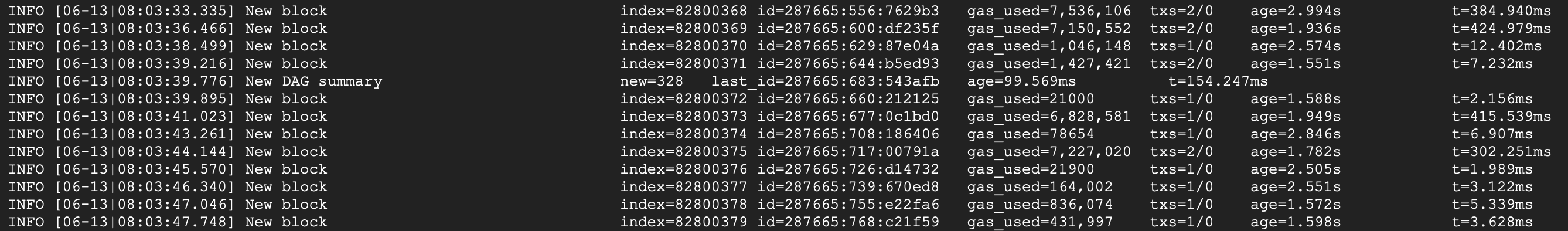 The Opera node should start and connect with the network, advancing the state by creating and processing new blocks. Please notice the **age** part of the log message, which tells you how far in the past these blocks are. The age should not exceed a couple of seconds once the node is fully synchronized.