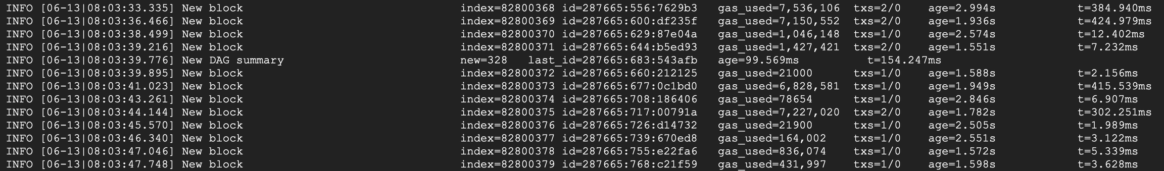 The Opera node should start and connect with the network, advancing the state by creating and processing new blocks. Please notice the age part of the log message, which tells you how far in the past these blocks are. The age should not exceed a couple of seconds once the node is fully synchronized.