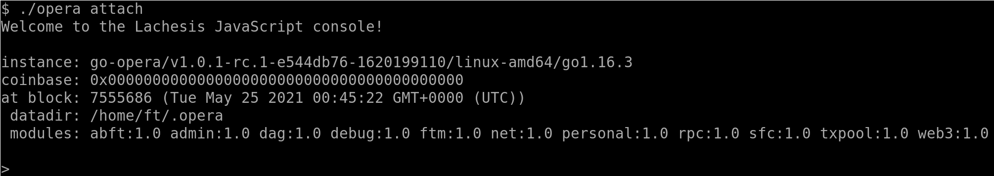 (validator)$ ./opera attachBy doing so, you will get a JavaScript console where you can directly interact with the Opera node and e.g. send transactions (which you will do in a moment):